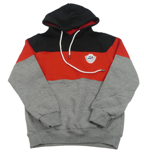 Černo-červeno-šedá mikina s nášivkou a kapucí