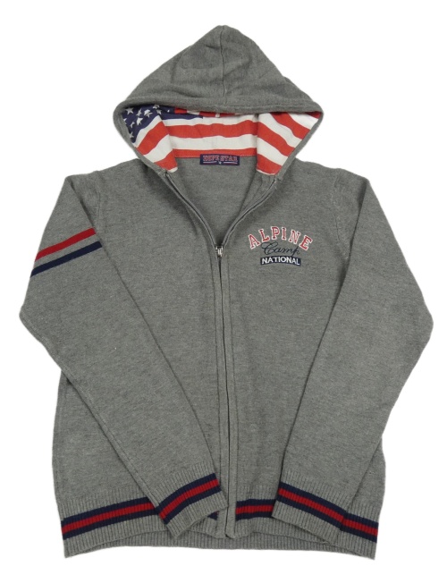 Šedý melírovaný vlněný propínací svetr s nápisem a kapucí