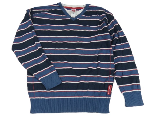Modrošedo-tmavomodro-bílo-červený pruhovaný svetr se všitým trikem C&A