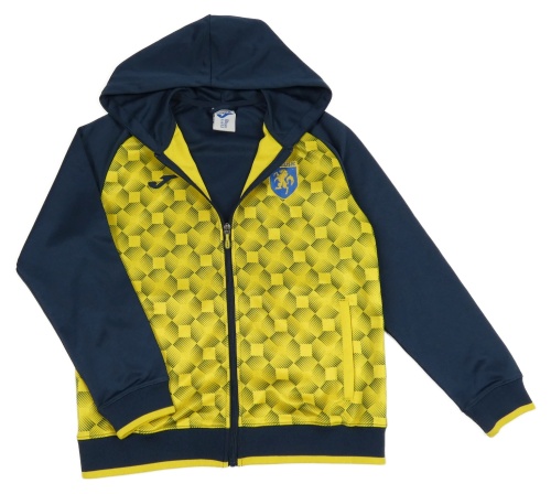 Tmavomodro-žlutá propínací sportovní mikina s výšivkou a kapucí Joma