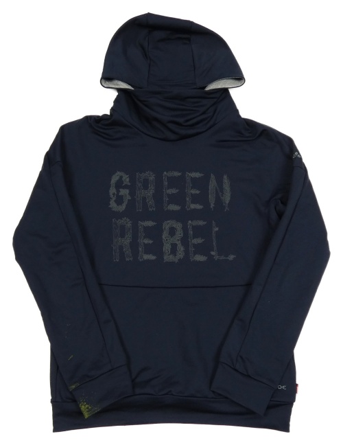 Tmavomodrá sportovní mikina s nápisem a kapucí