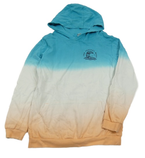 Azurovo-bílo-světleoranžová mikina s nápisem a vlnou a kapsou a kapucí Tu