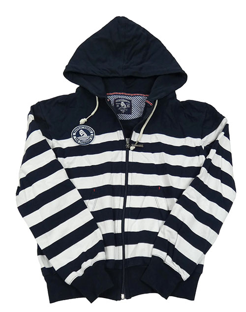 Tmavomodro-bílá pruhovaná propínací mikina s nášivkou a kapucí