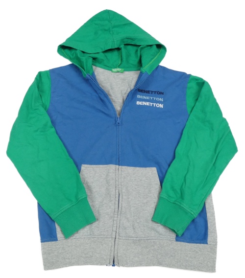 Modro-zeleno-šedá propínací mikina s nápisem a kapucí Benetton