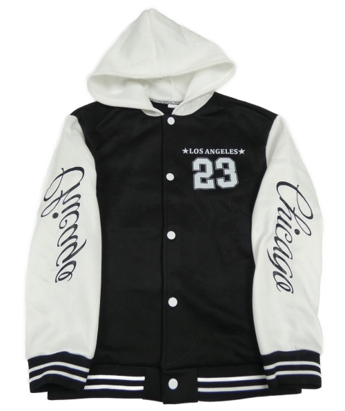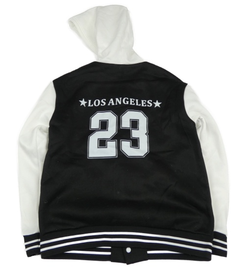 Černo-bílá baseballová mikina s číslem a nápisy a kapucí