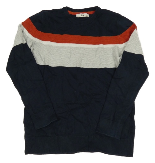 Tmavomodro-světlešedo-bílo-karmínový svetr C&A