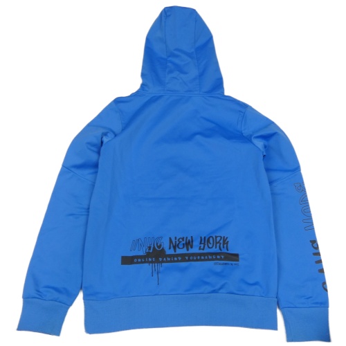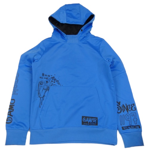 Modrá sportovní mikina s nápisy a ovladačem a kapucí