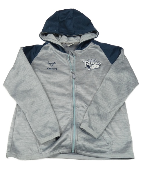 Šedo-tmavomodrá melírovaná propínací thermo mikina s výšivkou a kapucí