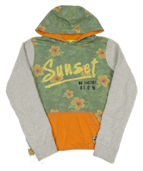 Zeleno-šedo-oranžová květovaná mikina s nápisy a kapucí