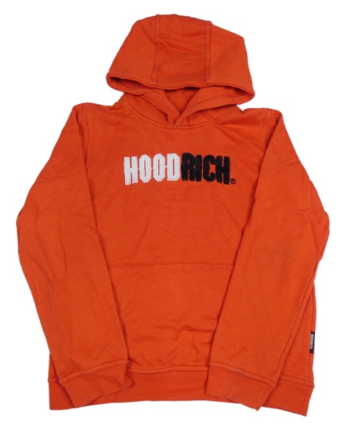 Červená mikina s nápisem a kapucí