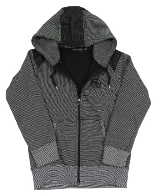 Černo-bílá pruhovaná propínací mikina s koženkou a kapucí Phillip Plein
