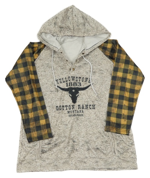 Béžová melírovaná mikina s býkem a kostkovanými rukávy a kapucí