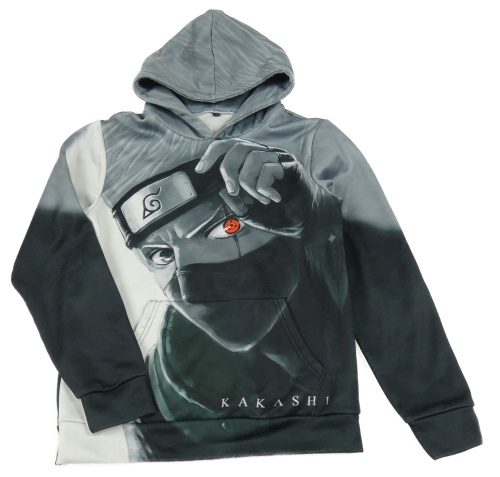 Černo-šedo-bílá teplá mikina s potiskem - KAKASHI a kapsou a kapucí