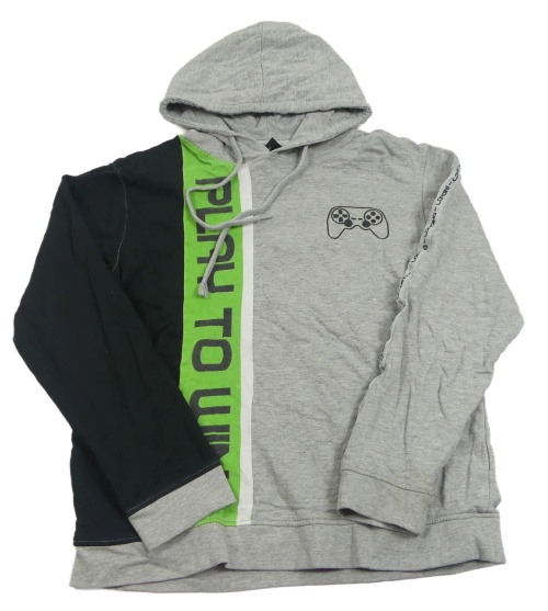 Šedo-černo-zelená mikina s nápisem a ovladačem a kapucí