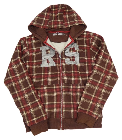 Hnědo-červeno-smetanová kostkovaná zateplená propínací mikina s číslem a kapucí