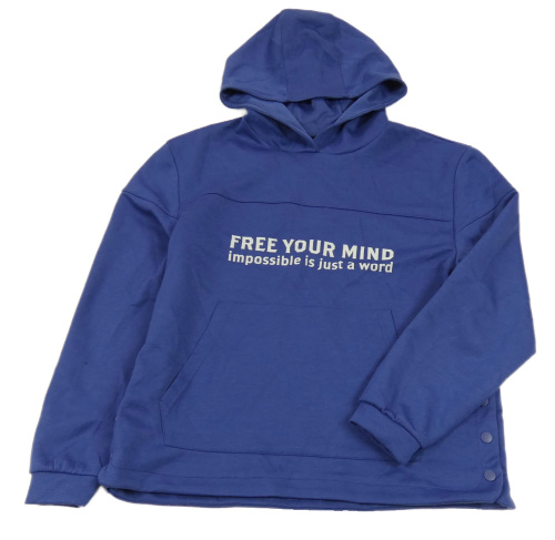 Tmavomodrá mikina s nápisem a kapucí