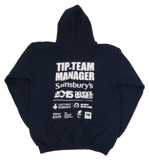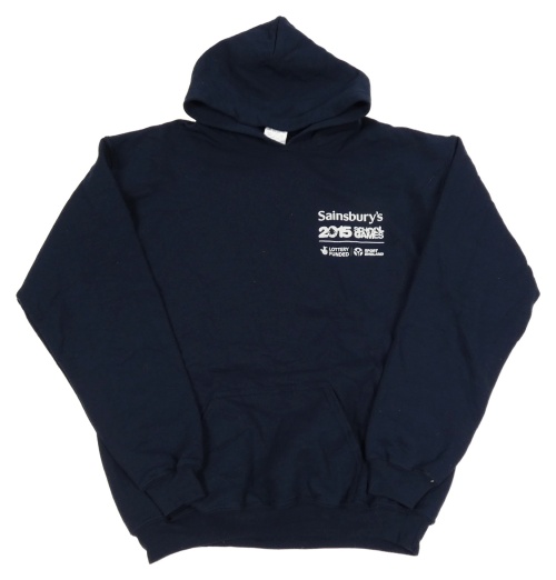 Tmavomodrá mikina s nápisy a kapucí