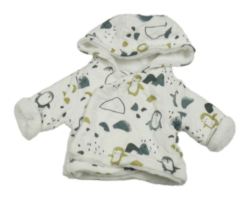 Bílá prošívaná zateplená propínací mikina s tučňáky a kapucí