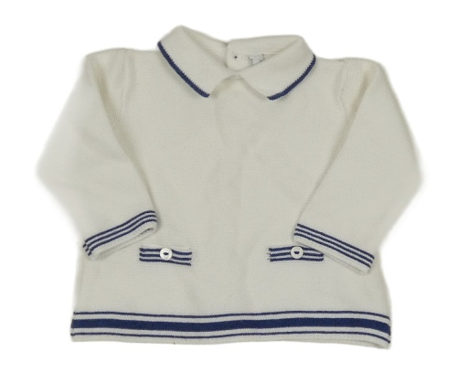 Bílý svetr s límečkem a tmavomodrým lemem