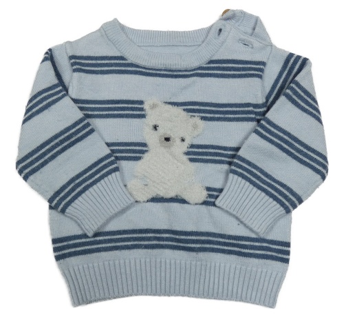 Světlemodro-tmavomodrý pruhovaný svetr s medvídkem little nutmeg