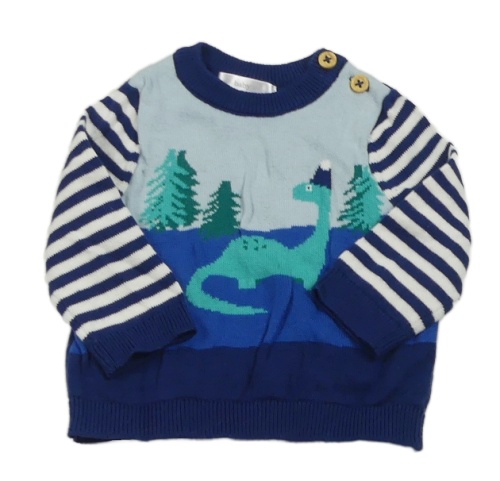 Tmavomodro-modro-bílý svetr s dinosaurem a pruhy na rukávech M&Co.
