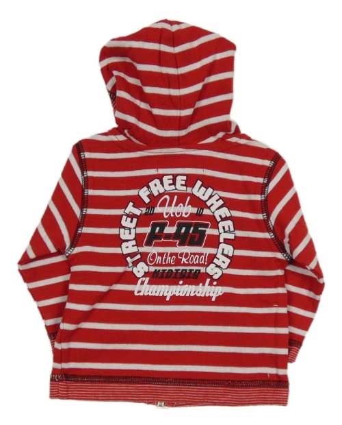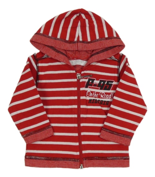 Červeno-bílá pruhovaná propínací mikina s nápisy a kapucí