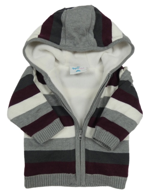 Šedo-bílo-vínový pruhovaný zateplený svetr s kapucí Topomini