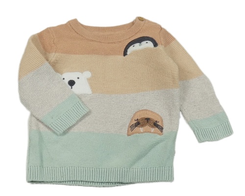Světlezeleno-šedo-oranžový pruhovaný svetr se zvířátky F&F