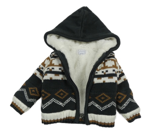 Tmavošedo-bílo-hnědý vzorovaný pletený propínací zateplený svetr s kapucí lucky kids
