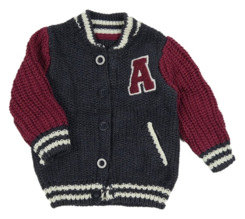 Tmavomodro-vínový propínací svetr s písmenem Matalan