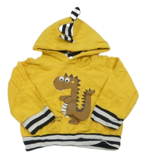 Žluto-pruhovaná mikina s dinosaurem a kapucí