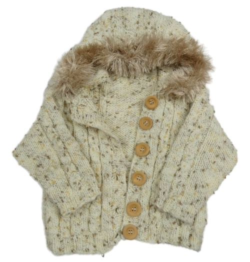 Béžový melírovaný propínací svetr s kožešinou na kapuci