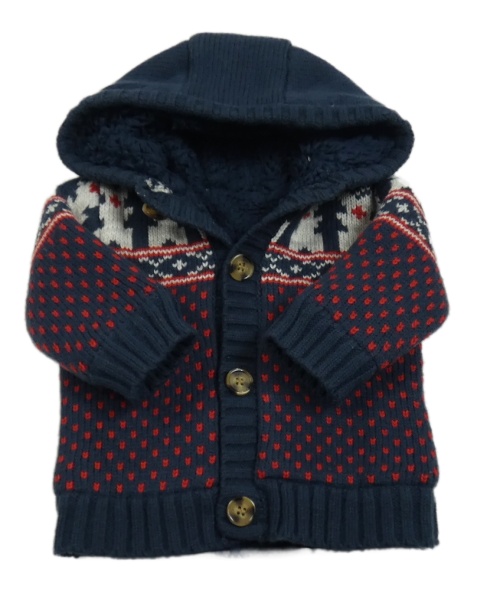 Tmavomodro-šedo-červený vzorovaný zateplený propínací svetr s kapucí George