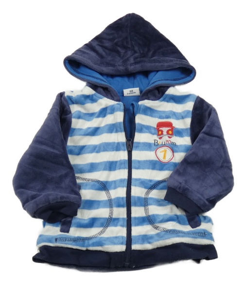 Modro-bílá pruhovaná sametová propínací mikina s autem a kapucí