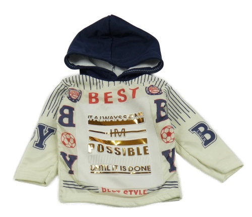 Smetanovo-tmavomodrá mikina s nápisem a kapucí