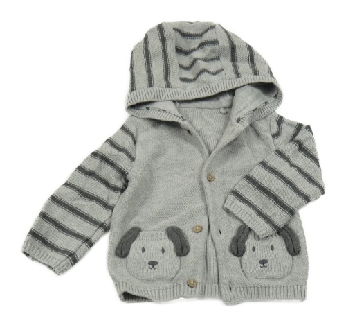 Šedo-pruhovaný propínací svetr s pejskem a kapucí Nutmeg