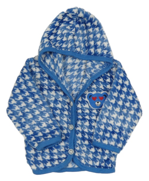 Modro-bílý vzorovaný propínací chlupatý svetr s kapucí