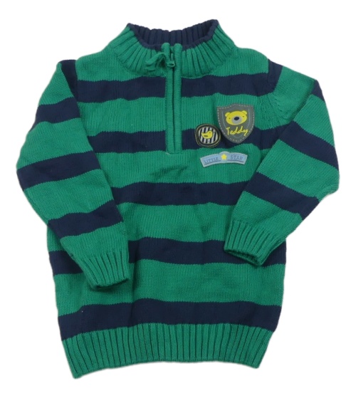 Zeleno-tmavomodrý pruhovaný svetr s nášivkami