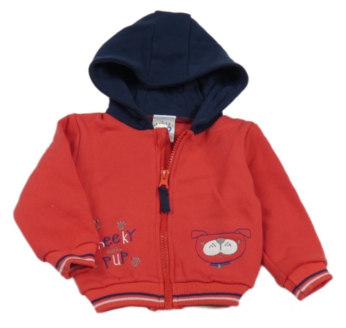 Jahodovo-tmavomodrá propínací mikina s pejskem a kapucí