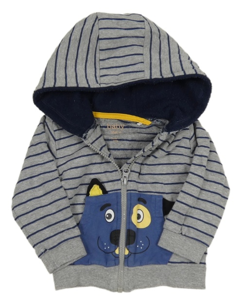 Šedo-tmavomodrá pruhovaná propínací mikina se psem a kapucí M&Co.
