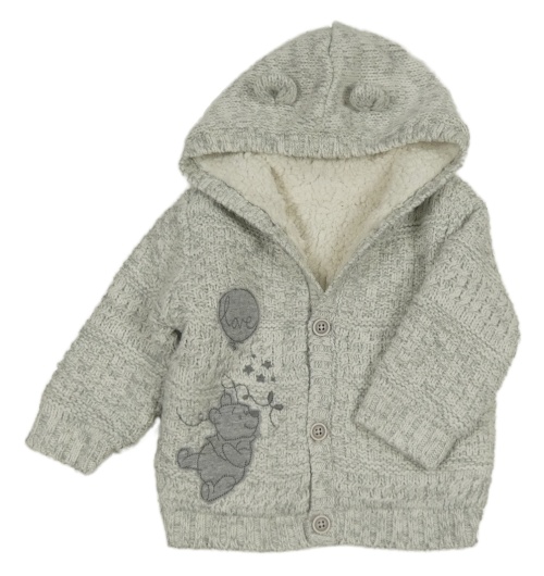 Šedo-bílý melírovaný vzorovaný pletený propínací zateplený svetr s Pú a kapucí s oušky George
