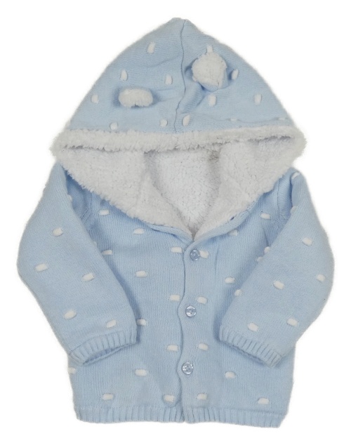 Světlemodrý propínací zateplený svetr s 3D puntíky a kapucí