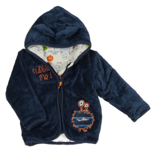 Tmavomodrá sametová propínací zateplená mikina s příšerkou a kapucí