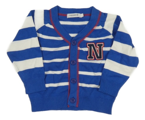 Modro-bílý pruhovaný propínací svetr s písmenem Noppies