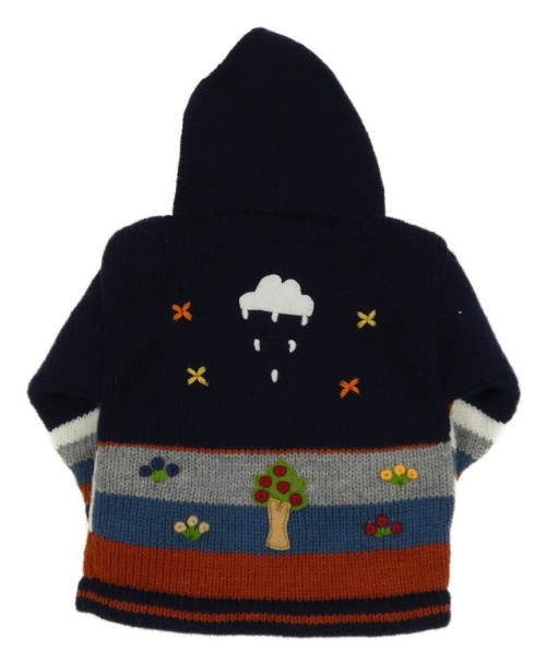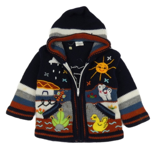 Tmavomodro-barevný propínací svetr s obrázky a kapucí