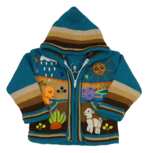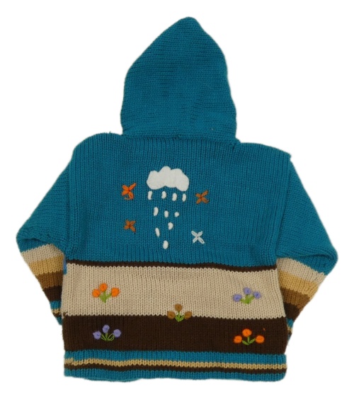 Tyrkysovo-béžový propínací svetr s obrázky a kapucí