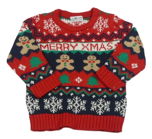 Červeno-tmavomodro-bílý vzorovaný svetr se perníčky so cute