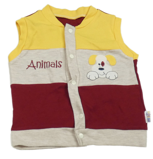 Žluto-šedo-vínová bavlněná propínací vesta s pejskem