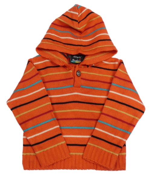 Tmavooranžovo-barevný pruhovaný pletený svetr s kapucí