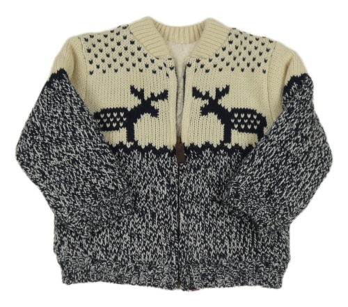 Smetanovo-bílo-tmavomodrý melírovaný propínací zateplený svetr se soby St. Bernard